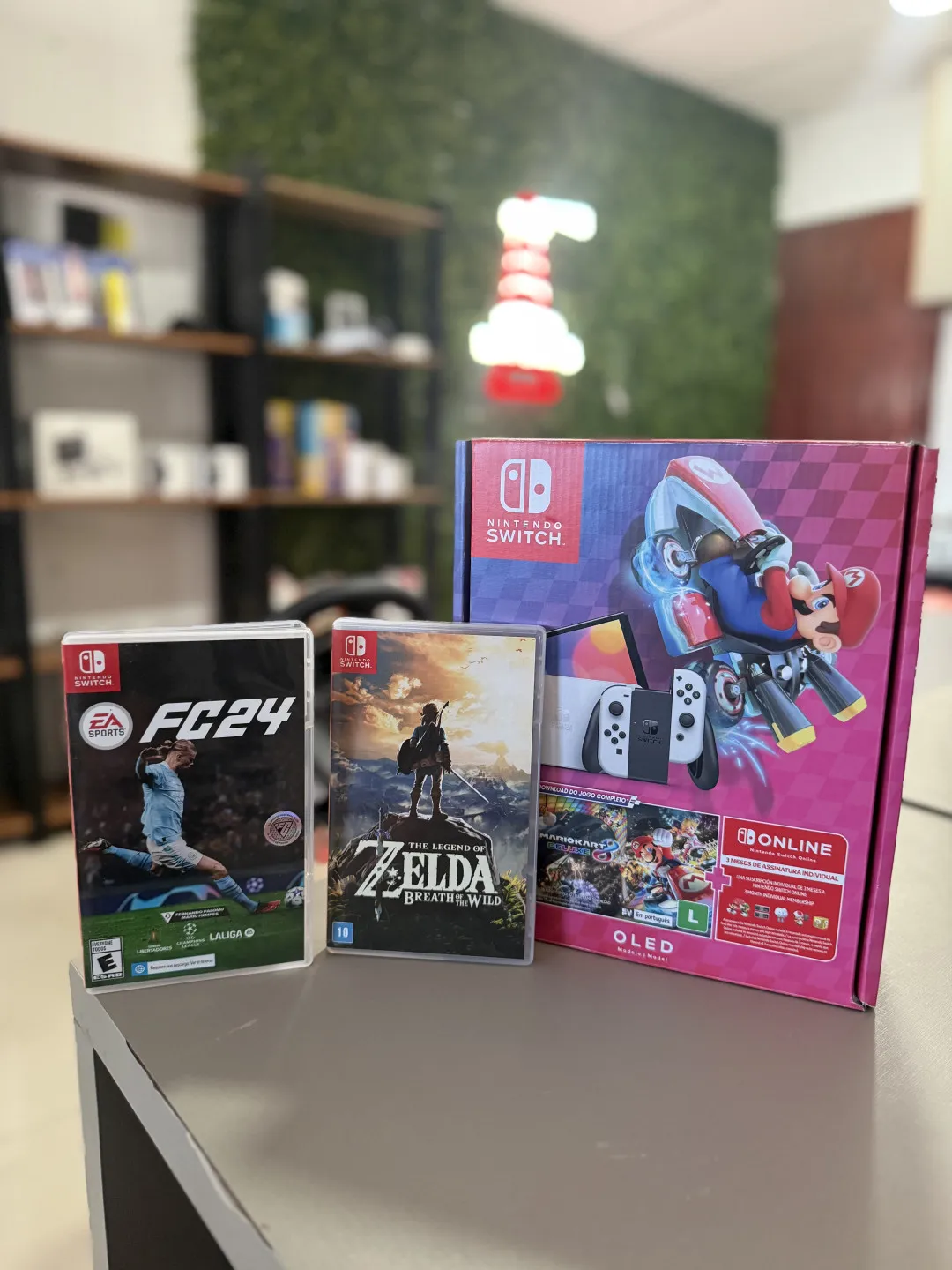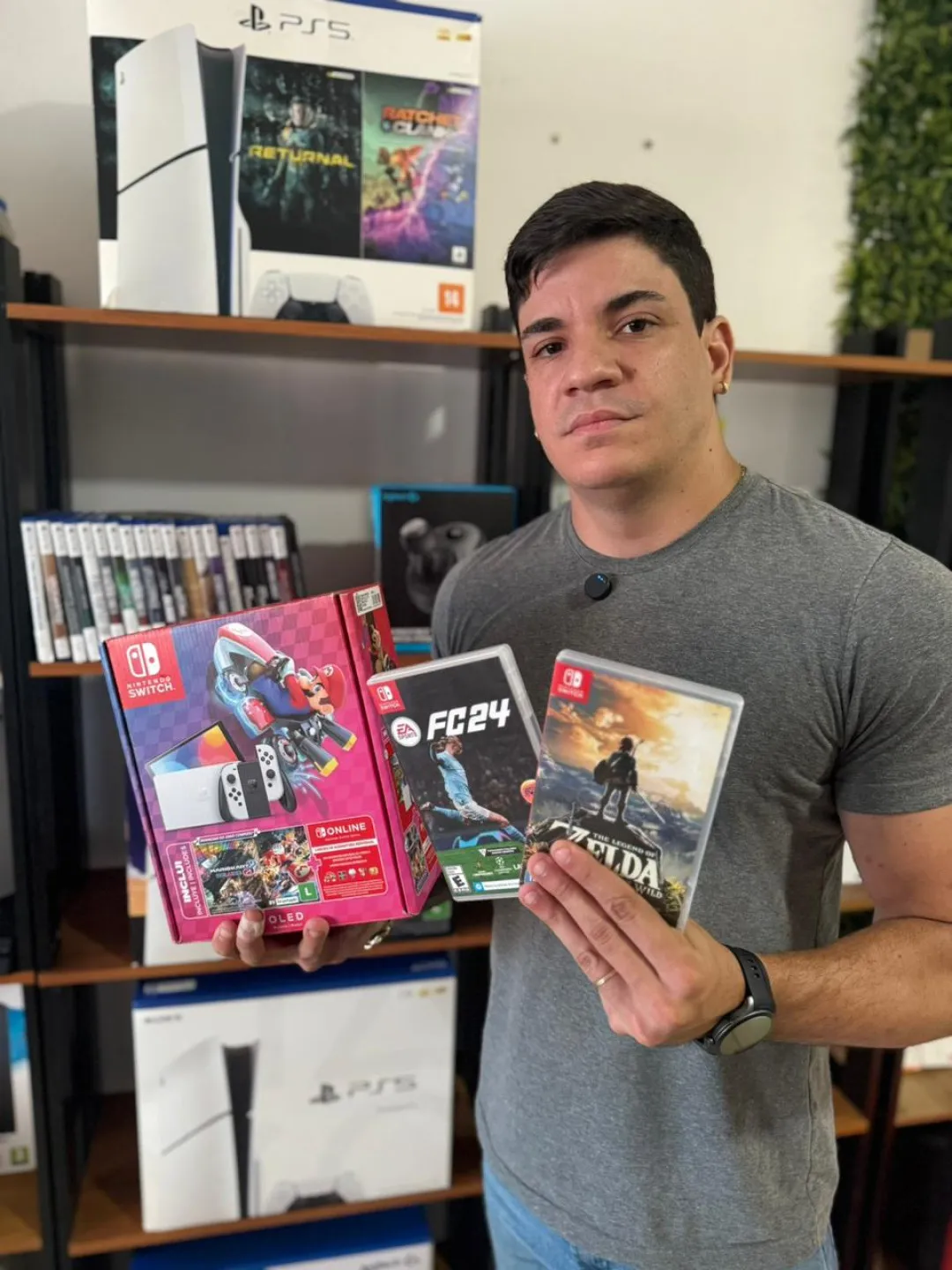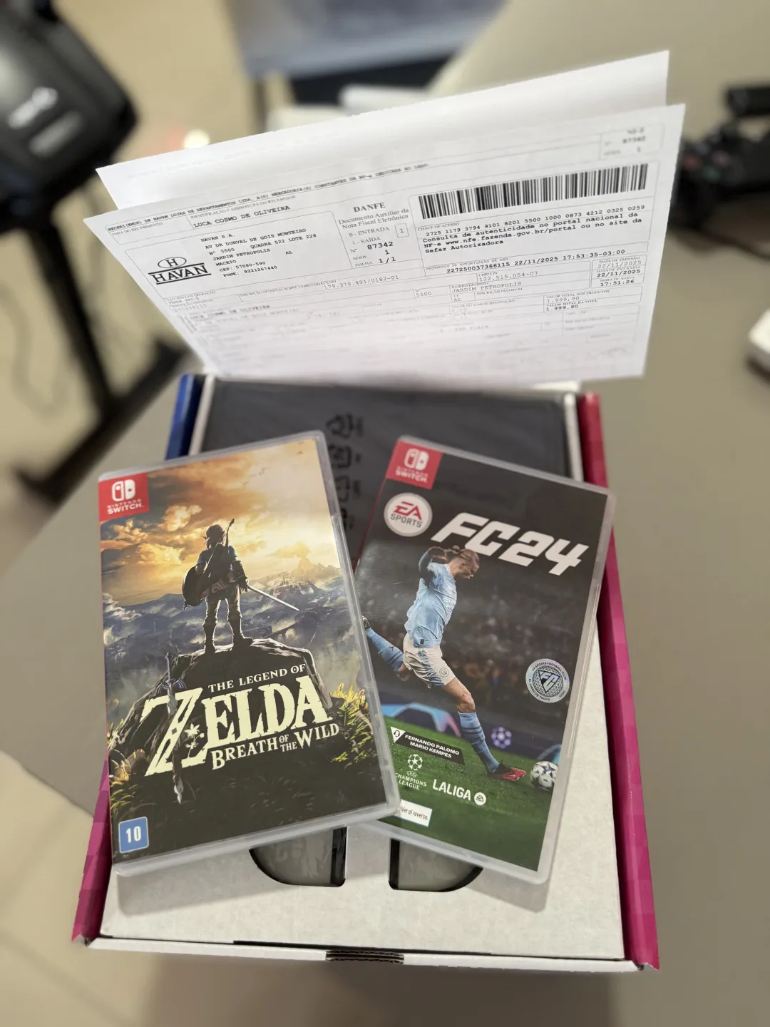 Prêmio: Nintendo Switch Oled + 2 Jogos Zelda Breath of the Wild e FC24.